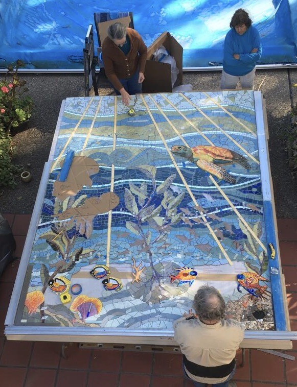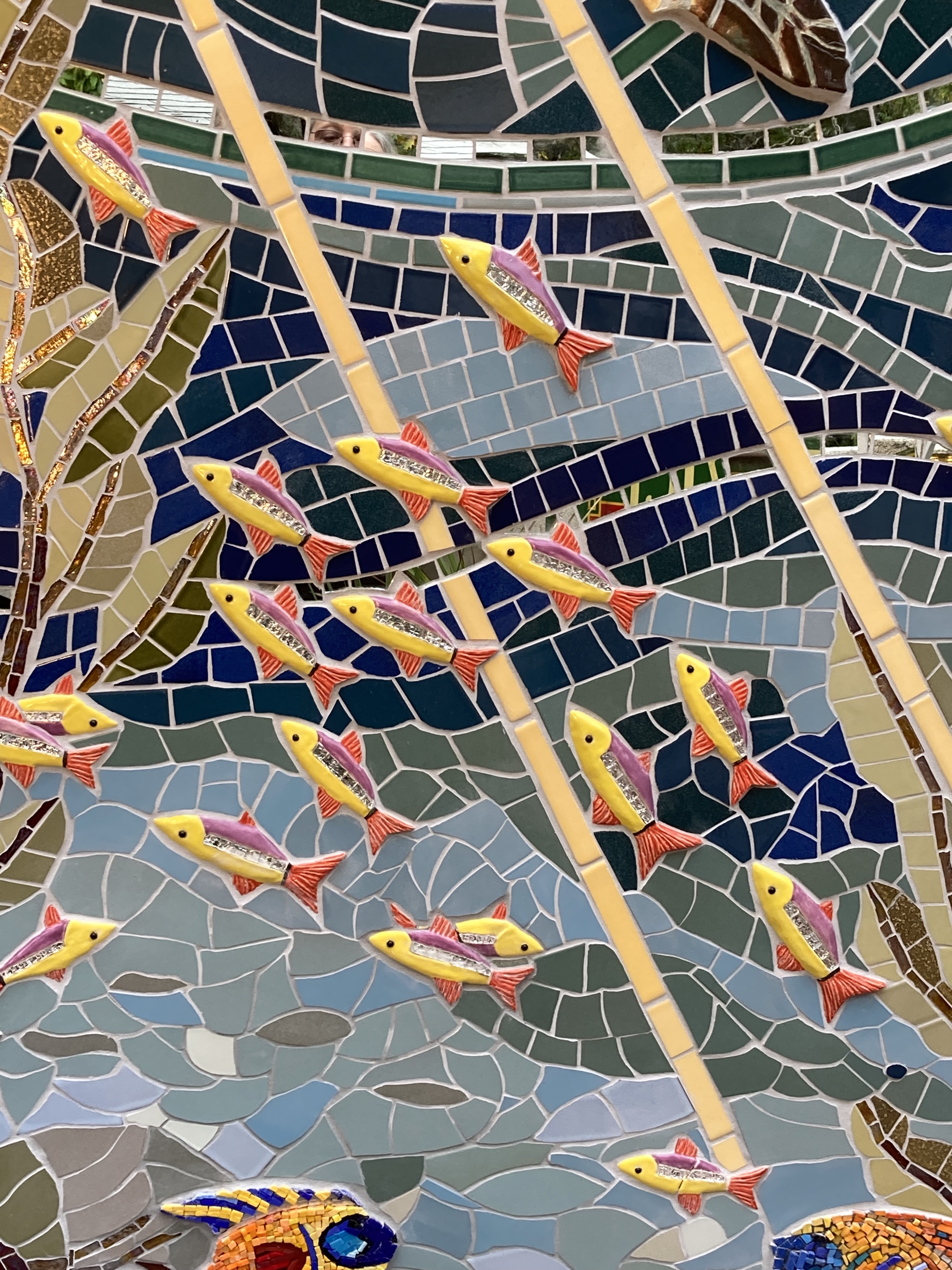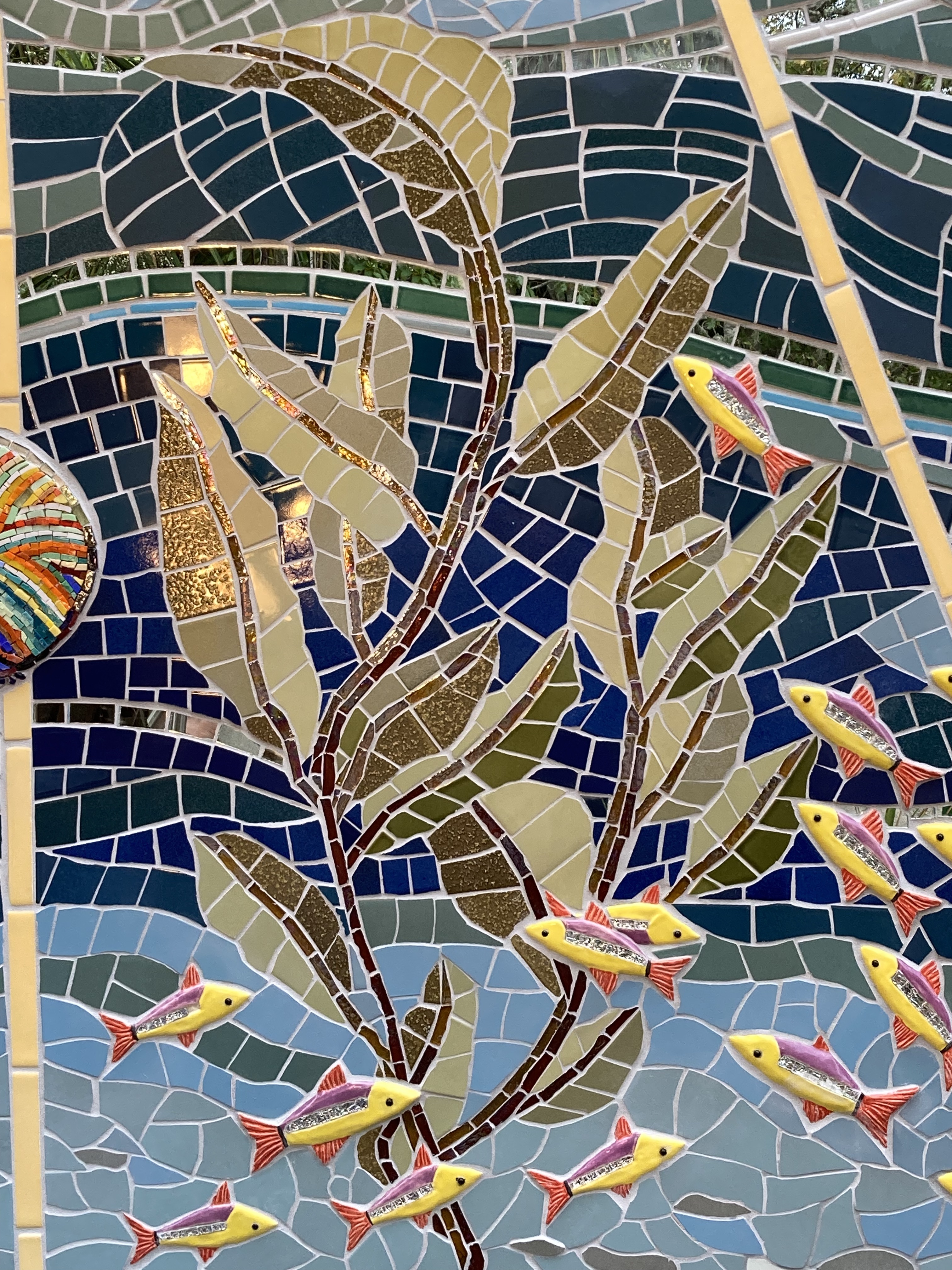 The ocean mural was originally inspired as a backdrop to a mosaic octopus sculpture. Over time, the mural took on a life of its own as a place to explore and unify mosaic techniques and materials in a ‘blue mind’ environment.