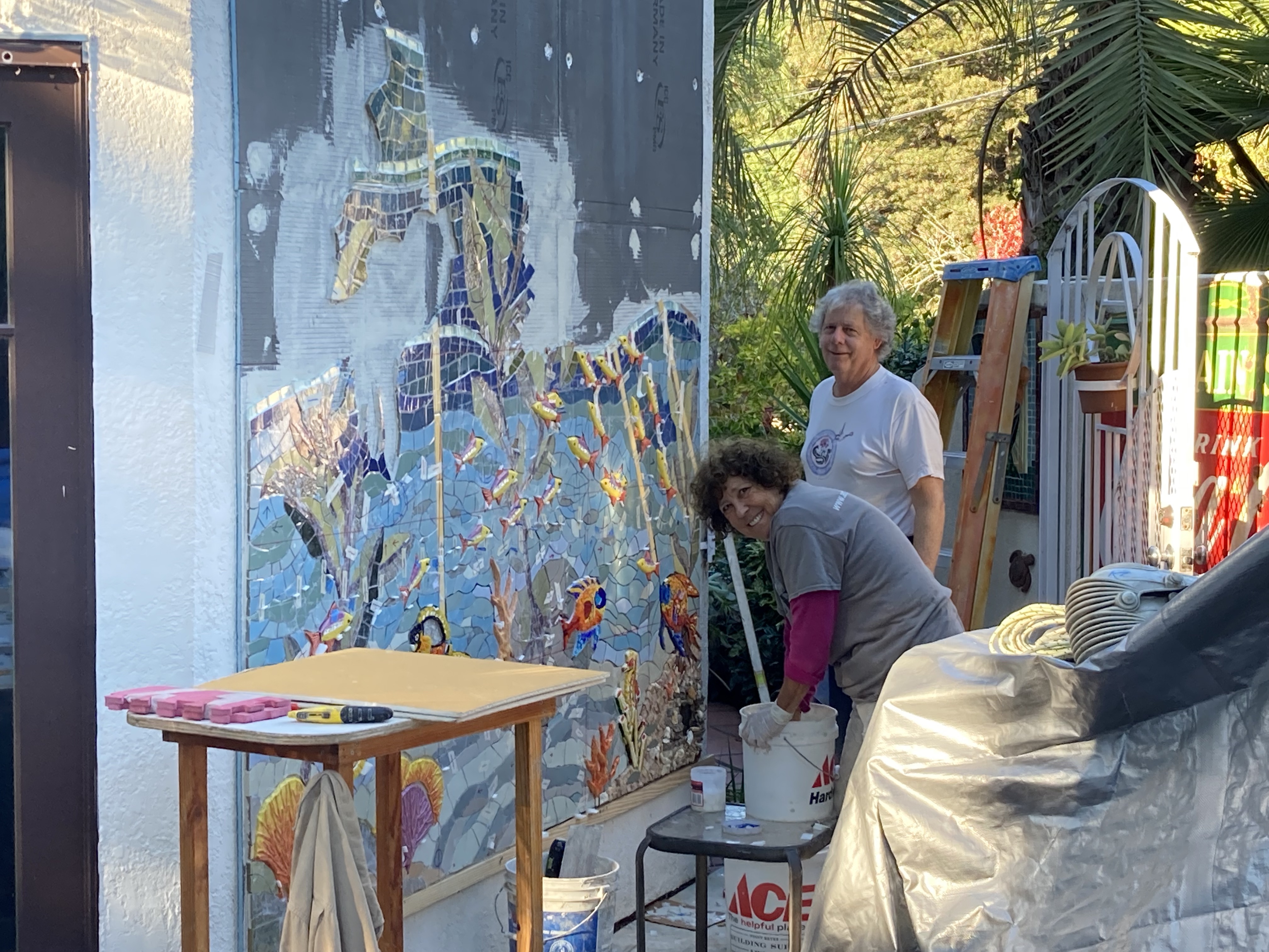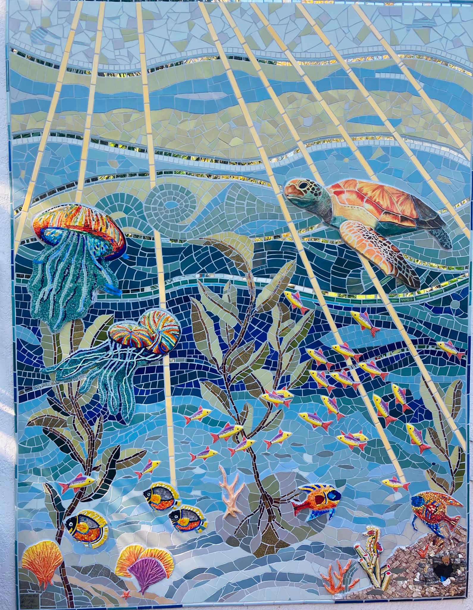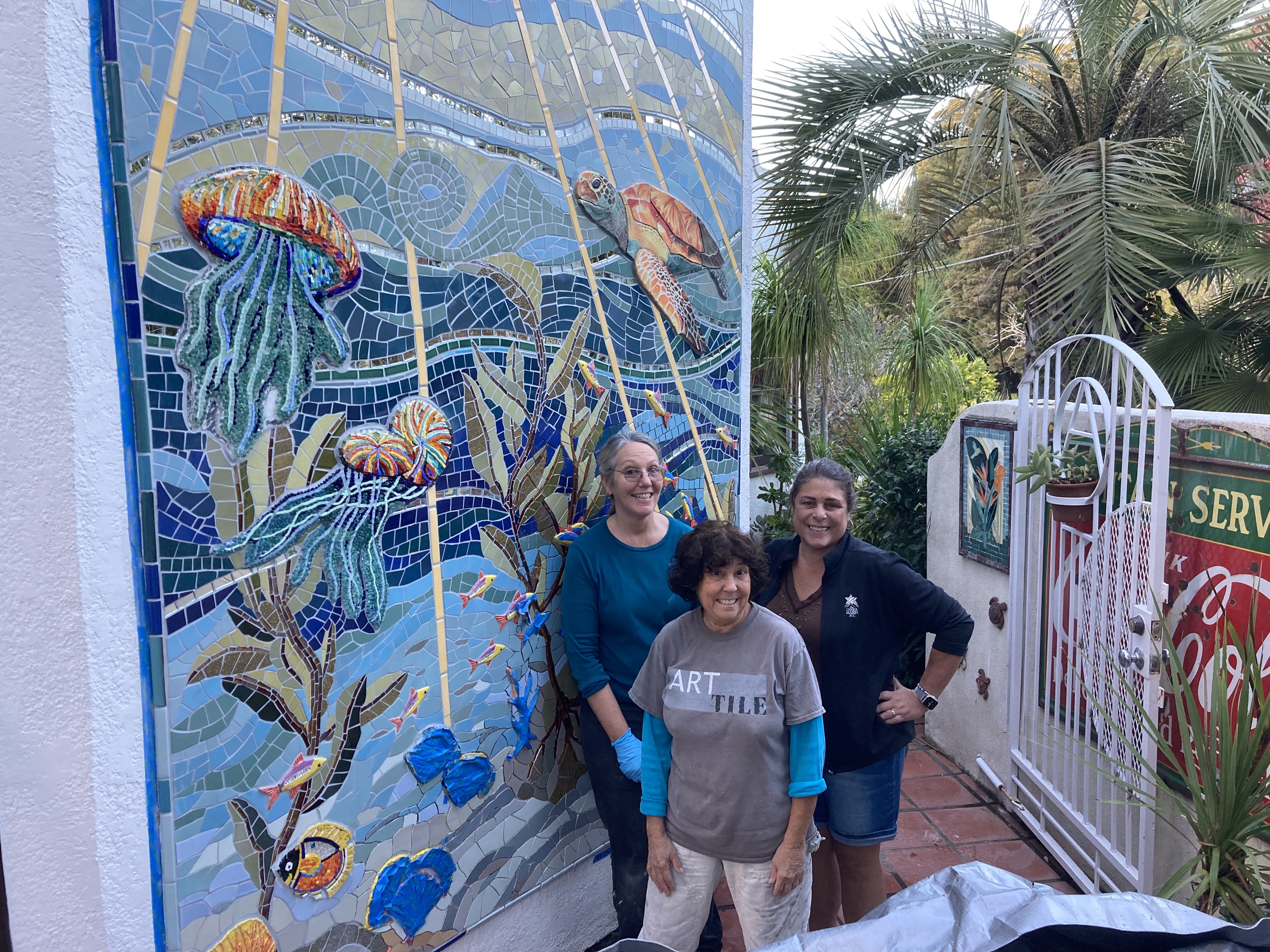The ocean mural was originally inspired as a backdrop to a mosaic octopus sculpture. Over time, the mural took on a life of its own as a place to explore and unify mosaic techniques and materials in a ‘blue mind’ environment.
